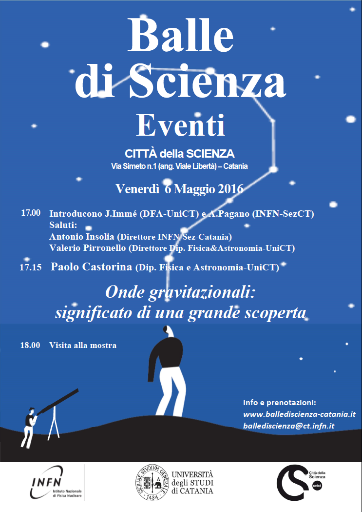 Venerdì 6 maggio, ore 17, conferenza “Onde gravitazionali: significato di una grande scoperta", che il prof. Paolo Castorina terrà a Città della Scienza nell’ambito degli eventi collaterali alla mostra Balle di Scienza.