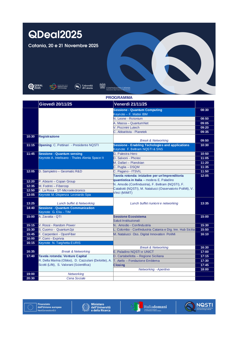 Le tecnologie quantistiche rappresentano una frontiera strategica per l'innovazione del Paese. Dopo la fase di sensibilizzazione promossa da Next-Generation EU, è il momento di tradurre l’interesse in azioni concrete di ricerca, sviluppo e trasferimento tecnologico. Per questo il National Quantum Science and Technology Institute (NQSTI) è lieto di annunciare QDeal25 - Ricerca, Impresa e Innovazione per l'Italia Quantistica, una due giorni organizzata in collaborazione con Confindustria Catania.