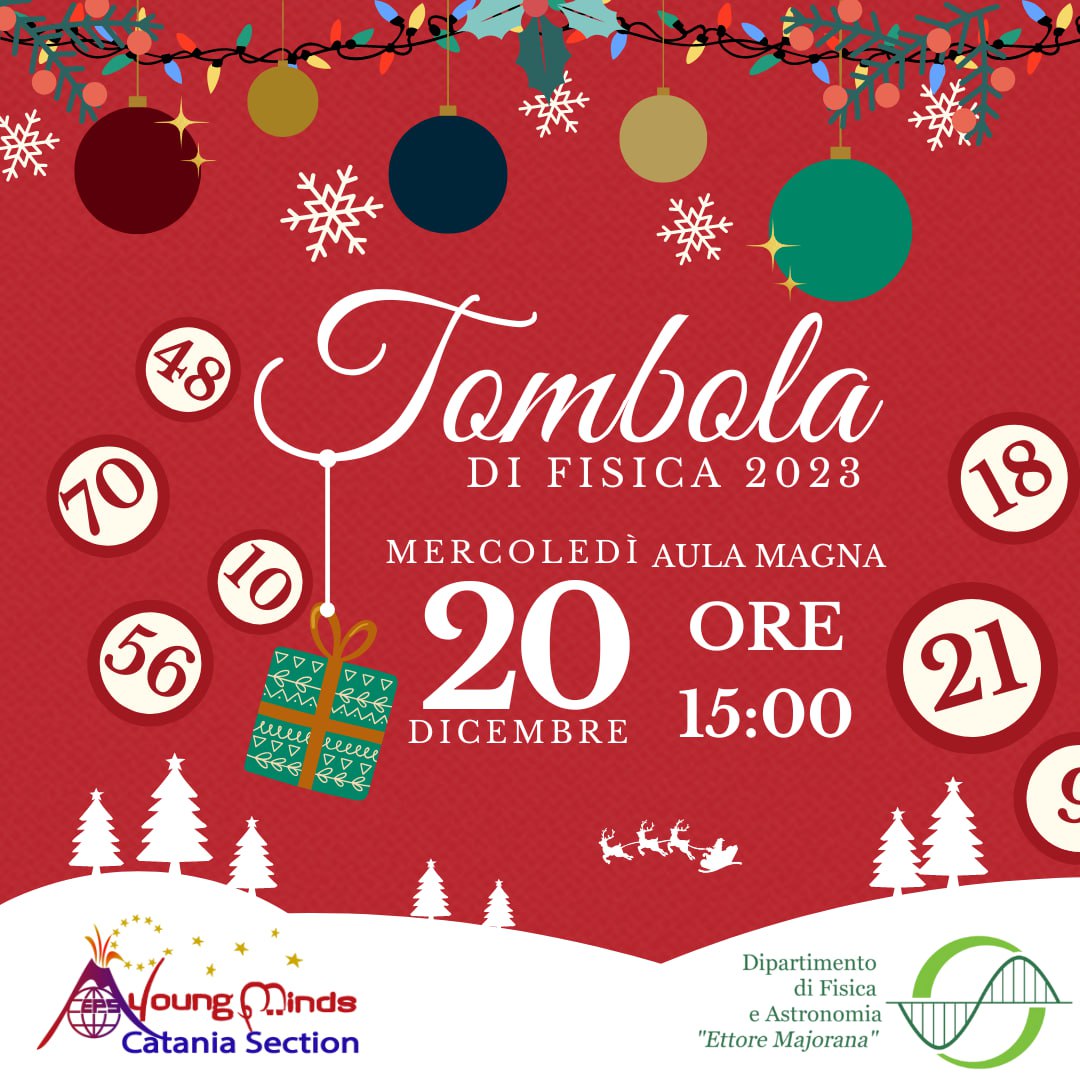 Giorno 20 dicembre 2023, con inizio alle ore 15:00, presso l'Aula Magna Natalizia del DFA, torna la Tombola di Fisica!