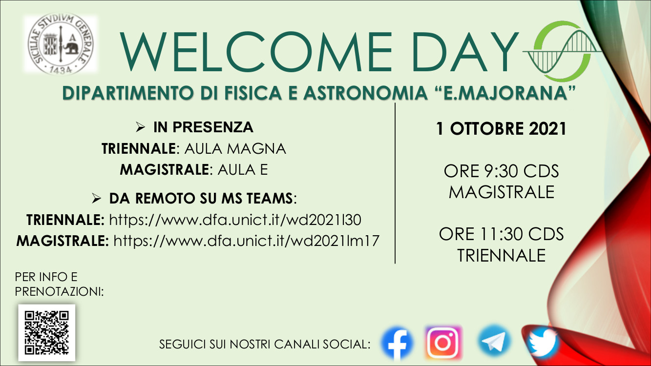 Venerdì 1° ottobre 2021, presso l'Aula E e l'Aula Magna del DFA, con inizio alle ore 09:30 e 11:30, avrà luogo il Welcome Day rivolto alle Studentesse e agli Studenti iscritti ai corsi di studio magistrale in Physics e triennale in Fisica, rispettivamente, nell'A.A. 2021/2022.