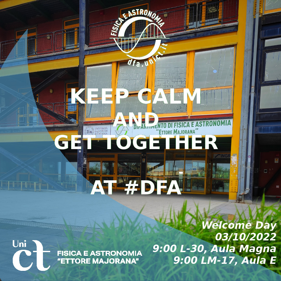 Lunedì 3 ottobre 2022, con inizio alle ore 09:00, presso l'Aula Magna (triennale) e l'Aula E (magistrale) si svolgerà il tradizionale Welcome Day: il Dipartimento dà il benvenuto alle nuove Studentesse e ai nuovi Studenti iscritte/i ai Corsi di laurea [triennale] in Fisica e Magistrale in Physics.