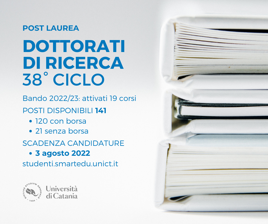 Pubblicato il Bando di ammissione ai Dottorati di ricerca presso l'Università di Catania (38° ciclo). Per il Dottorato in Fisica sono disponibili n. 12 posti, di cui 11 con borsa. Domande online entro il 3 agosto 2022.
