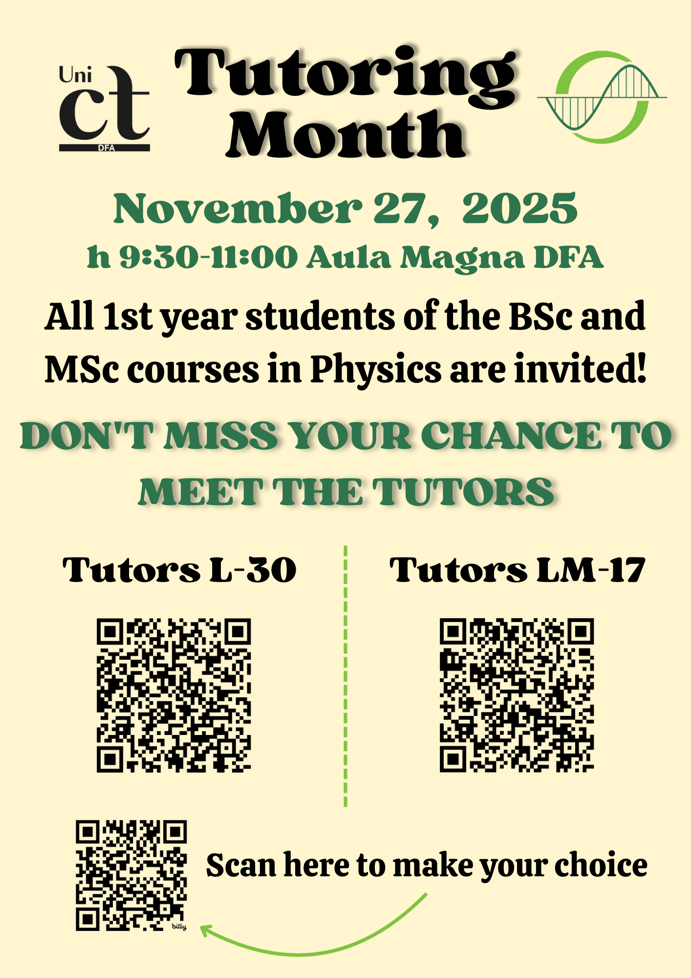 Le Studentesse e gli Studenti del Corso di laurea [triennale] in Fisica (L-30 R) e del Corso di laurea magistrale in Physics (LM-17 R) del DFA hanno facoltà di scegliere un Tutor tra i Docenti che ogni anno si rendono disponibili per svolgere tale compito. Il Tutor non è (o sarà) necessariamente il proprio relatore di tesi/progetto finale. Il Tutor affianca la/o Studente/ssa, ne guida le scelte (ad esempio, nel corso della definizione del piano di studi), dà suggerimenti, ove possibile, su come affrontare eventuali problemi organizzativi o burocratici, legati alla carriera dei suoi studi.