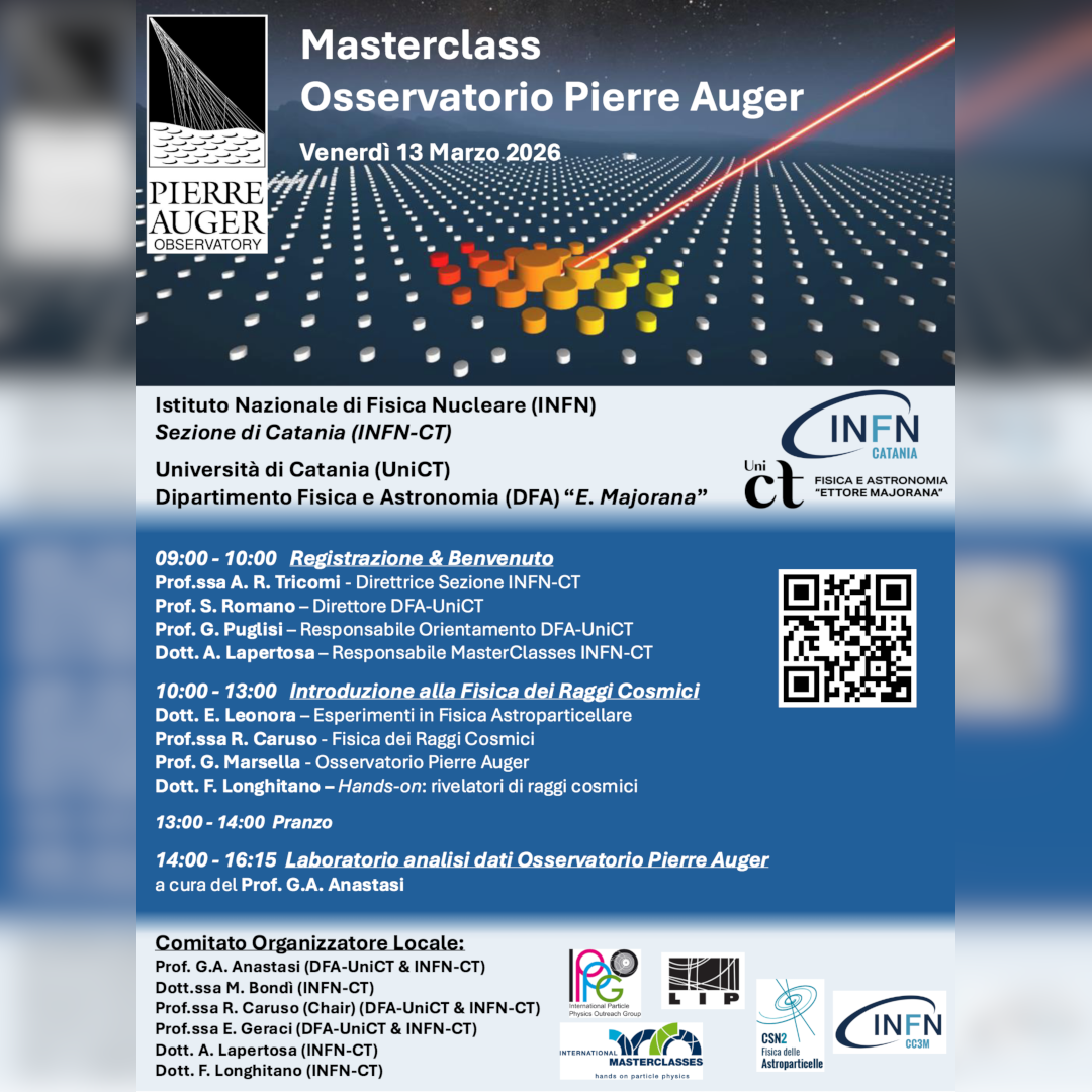 La Masterclass dell'Osservatorio Pierre Auger è organizzata dalla Sezione di Catania dell'Istituto Nazionale di Fisica Nucleare (INFN-CT) e ospitata dal Dipartimento di Fisica e Astronomia "Ettore Majorana" dell’Università degli Studi di Catania (DFA-UniCT).