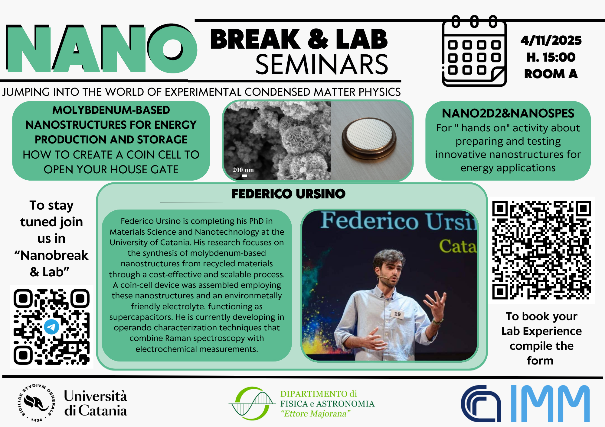 Il seminario appartiene al ciclo NanoBreak&Lab: jumping into the world of experimental condensed matter physics.