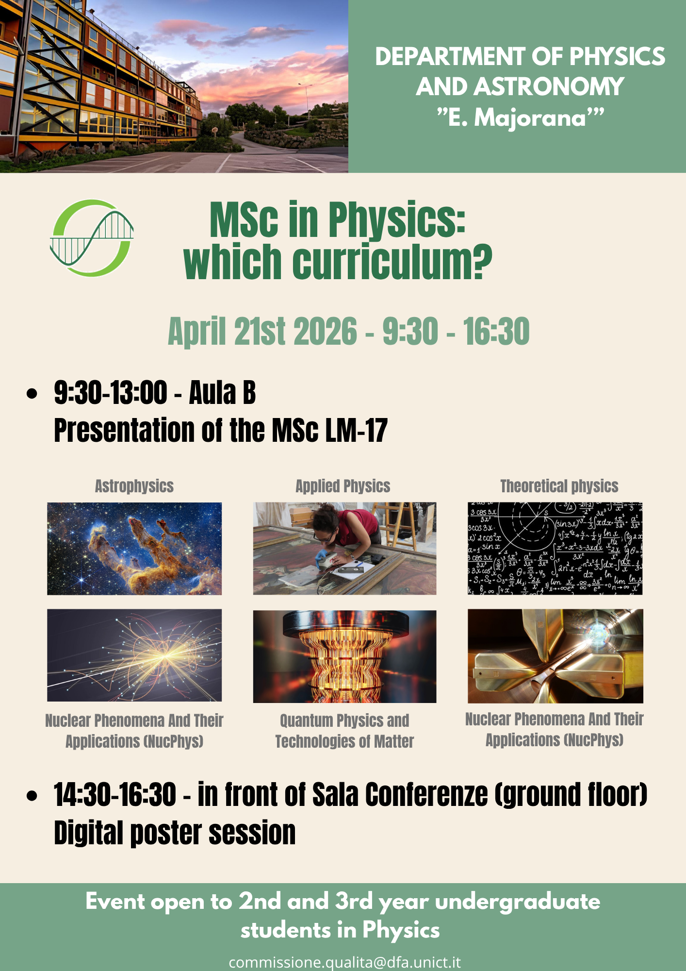 Giorno 21 aprile 2025 (ore 09:30-16:30), presso l'Aula B e di fronte la Sala Conferenze del DFA, i Referenti dei Curricula presenteranno il Corso di laurea magistrale in Physics (LM-17).