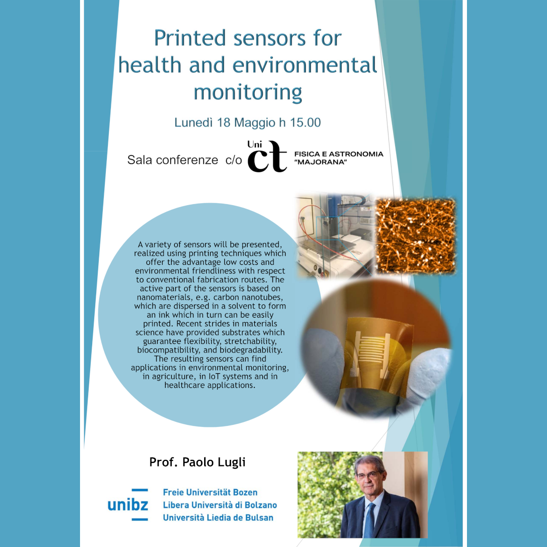 Giorno 18 maggio 2026, con inizio alle ore 15:00, presso la Sala Conferenze del DFA, il Prof. Paolo Lugli (Free University of Bozen-Bolzano, Bolzano, Italy), terrà un seminario dal titolo Printed sensors for health and environmental monitoring.