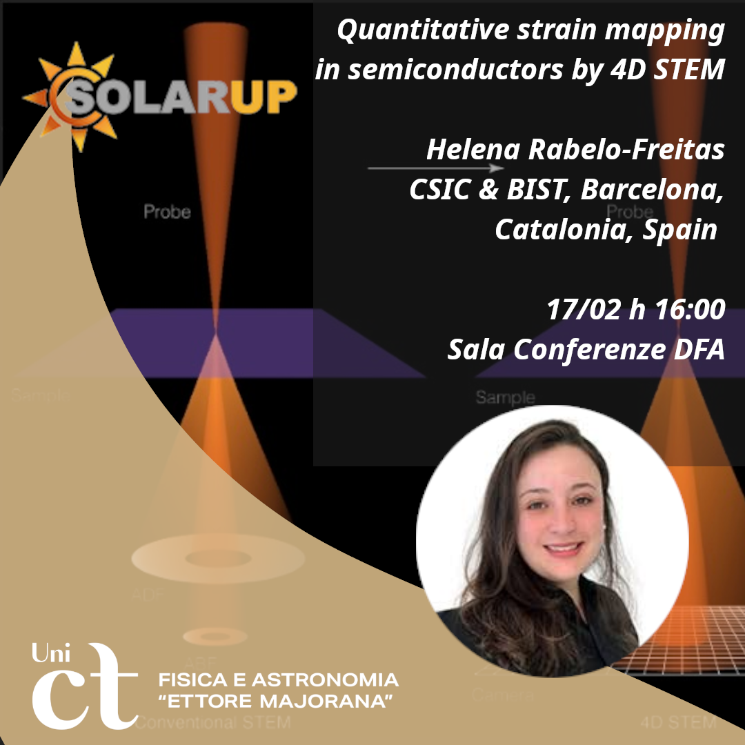 Giorno 17 febbraio 2026, con inizio alle ore 16:00, presso la Sala Conferenze del DFA, la Dr Helena Rabelo-Freitas (Catalan Institute of Nanoscience and Nanotechnology – ICN2 (CSIC and BIST), Campus UAB, Bellaterra, Barcelona, Catalonia, Spain) terrà un seminario dal titolo Quantitative strain mapping in semiconductors by 4D STEM.