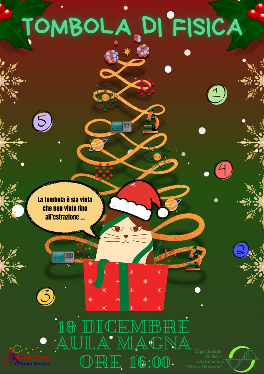 Giorno 18 dicembre 2025, con inizio alle ore 16:00, presso l'Aula Magna Natalizia del DFA, torna la Tombola di Fisica!