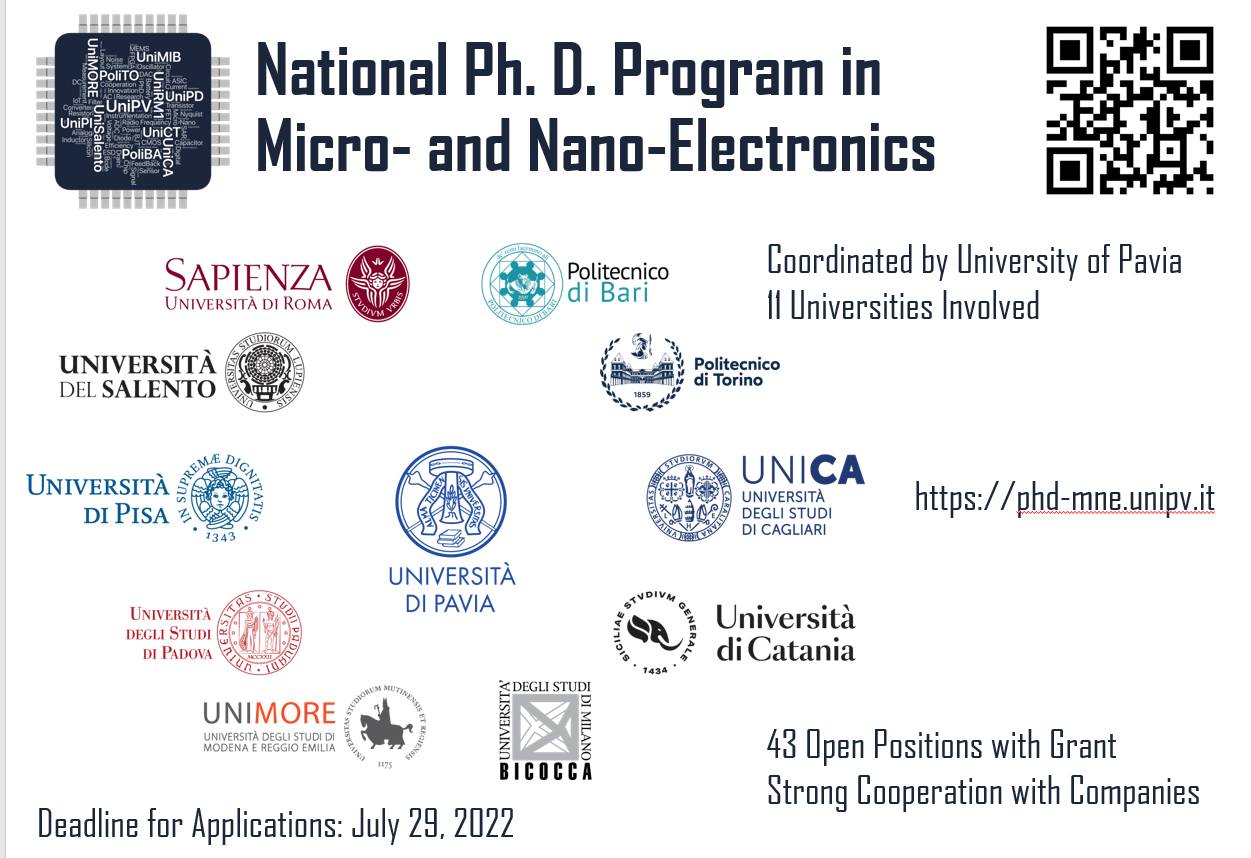 Venerdì 24/06/2022 è stato pubblicato il bando per 43 posizioni con borsa nell'ambito del Dottorato Nazionale in Micro- e Nano-Elettronica (PhD-MNE).