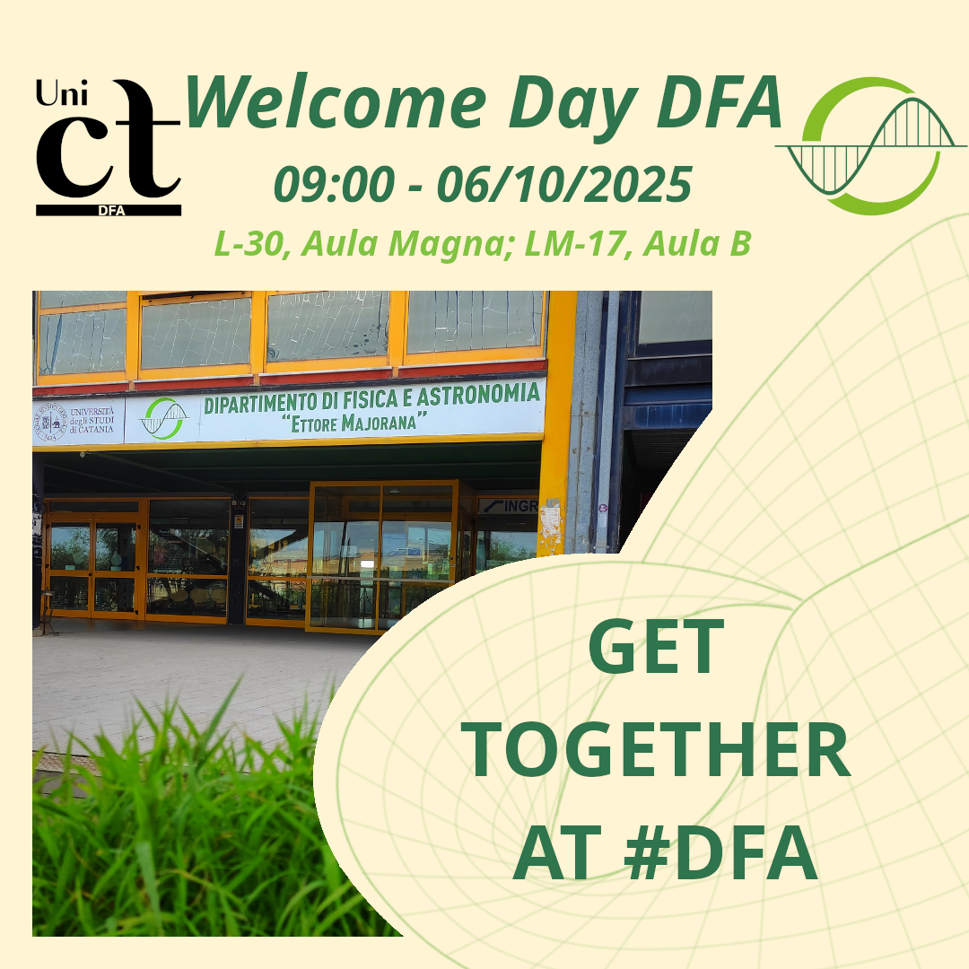 Lunedì 6 ottobre 2025, con inizio alle ore 09:00, presso l'Aula Magna (triennale) e l'Aula B (magistrale) si svolgerà il tradizionale Welcome Day: il Dipartimento dà il benvenuto alle nuove Studentesse e ai nuovi Studenti iscritte/i ai Corsi di laurea [triennale] in Fisica e Magistrale in Physics.